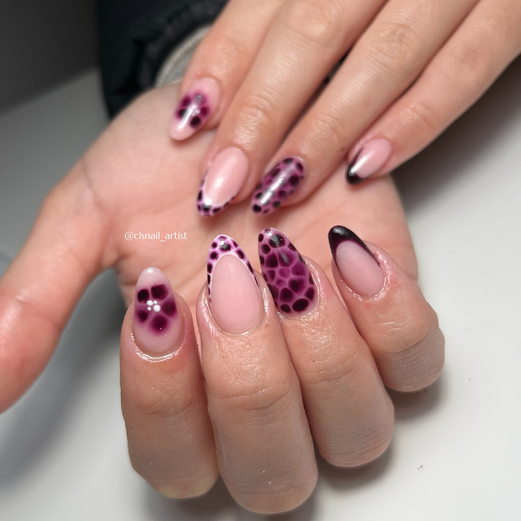 5. While it’s still wet, use a thin nail art brush or dotting tool to add drops or lines of colored gel polish on top of the blooming gel.